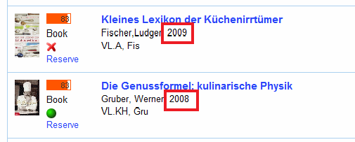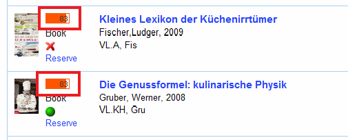 The color bar (marked red) indicates the relevance of the hit. The larger the bar, the higher is the chance that this is the title you are looking for. This indicator is only available in simple search. The number inside the bar indicates the relevance in percent.